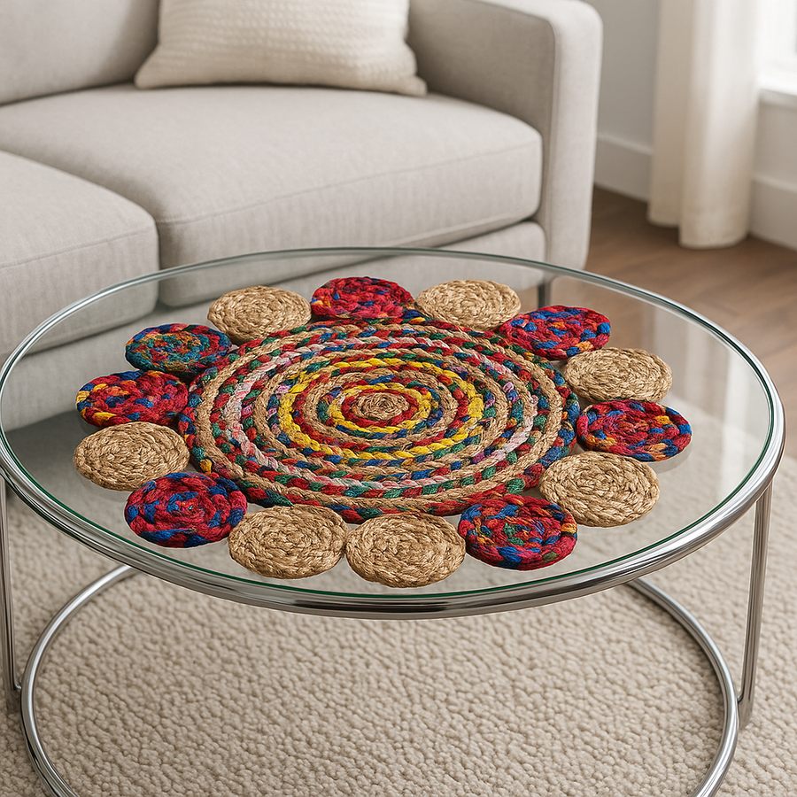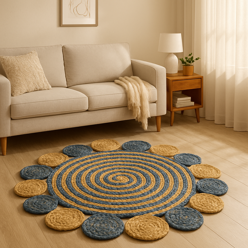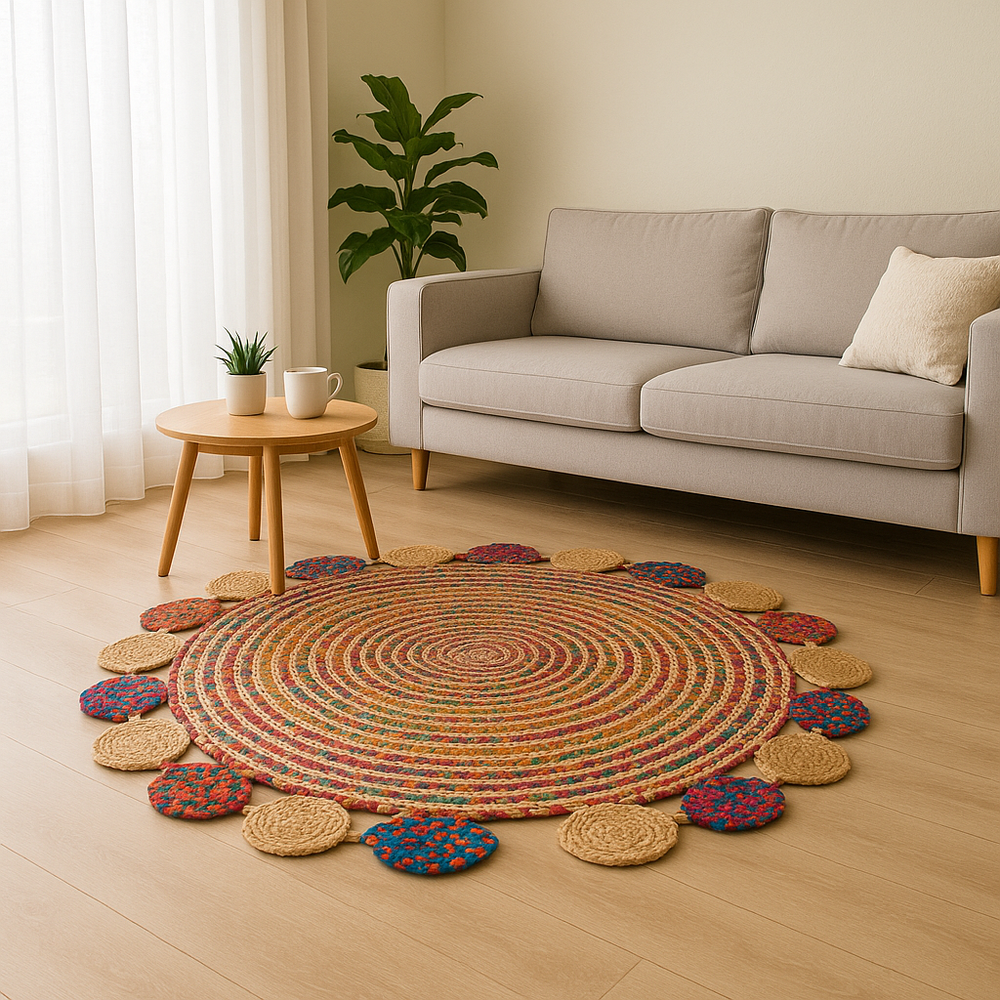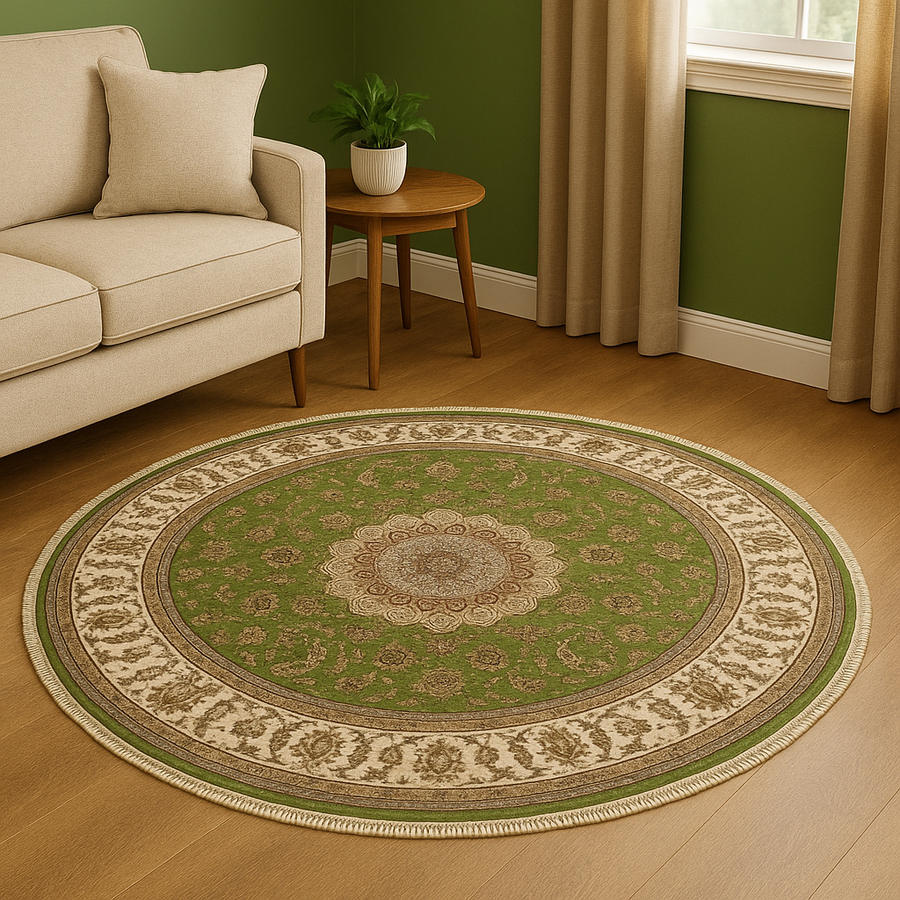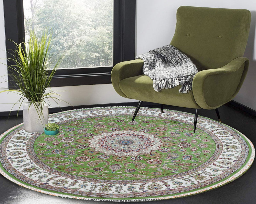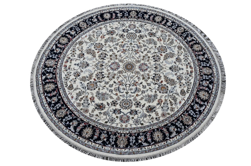Introducing our exquisite Nain and All over Kashan Handmade Woolen Round Rugs, a true masterpiece of craftsmanship. These rugs are meticulously Hand knotted by expert artisans using premium quality wool, resulting in a stunning piece that is both durable and long-lasting. Each rug is unique, with 178 unique knots per square inch, ensuring a high level of detail and intricacy. The round shape of these rugs adds a touch of elegance and sophistication to any space, and the fringe in blue, green, cream, and red colors adds a pop of color and texture. Whether you're looking to add a touch of warmth and comfort to your living room, bedroom, or dining room, our Handmade Woolen Round Rugs are the perfect choice.